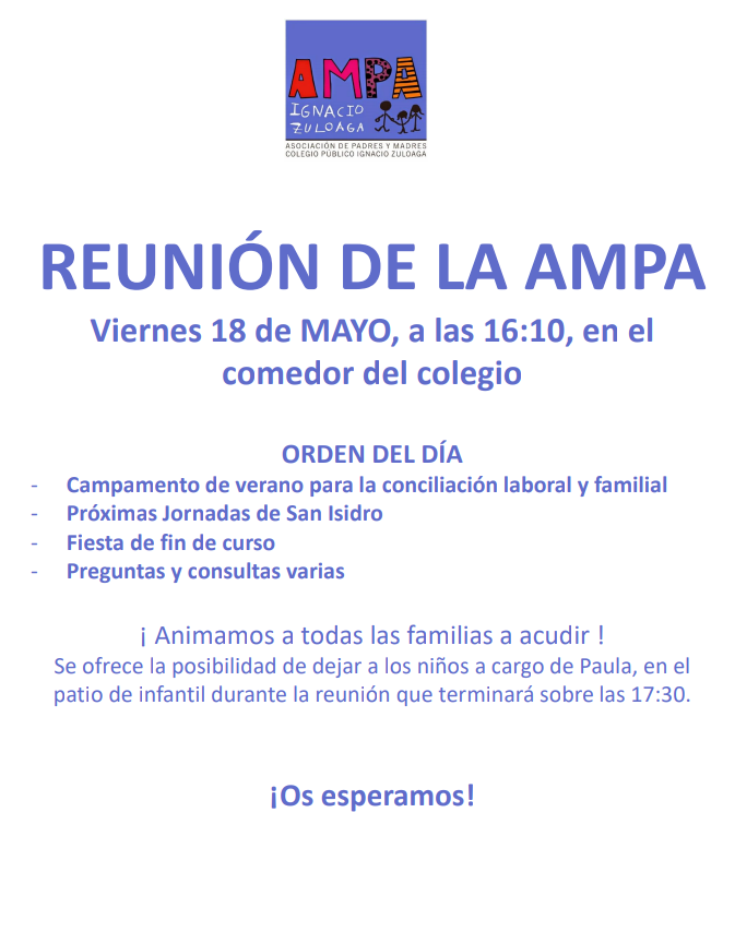 REUNIÓN DE LA AMPA VIERNES 18 MAYO Convocamos a los socios a la reunión de este viernes con el siguiente orden del día: Publicado en Asamblea.