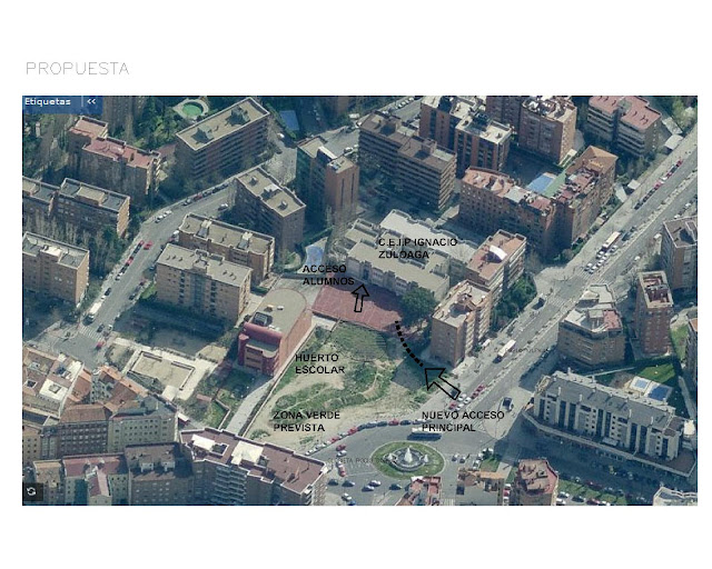Englobado dentro del proyecto de huerto escolar, se ha planteado crear un nuevo acceso al colegio desde Pablo Iglesias / Francos Rodríguez. Aquí os dejamos unas imágenes de la propuesta que está realizando el colegio en colaboración con padres y profesores; será una gestión larga con el ayuntamiento, en la que además de mejorar los accesos al colegio se consiga revalorizar este espacio colindante con el patio, ahora residual y degradado