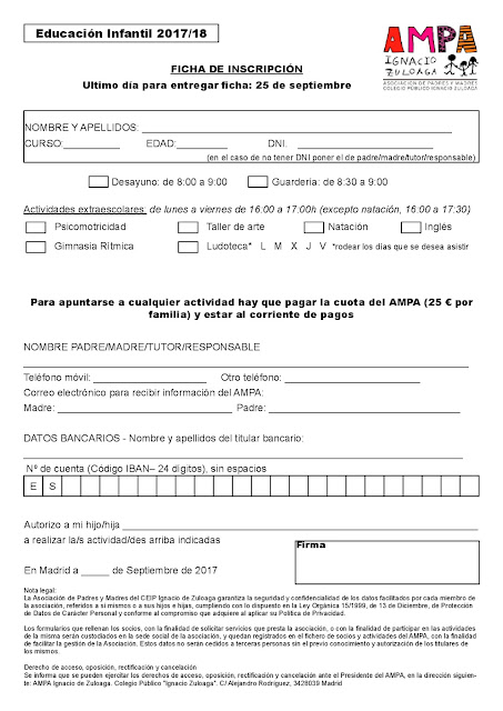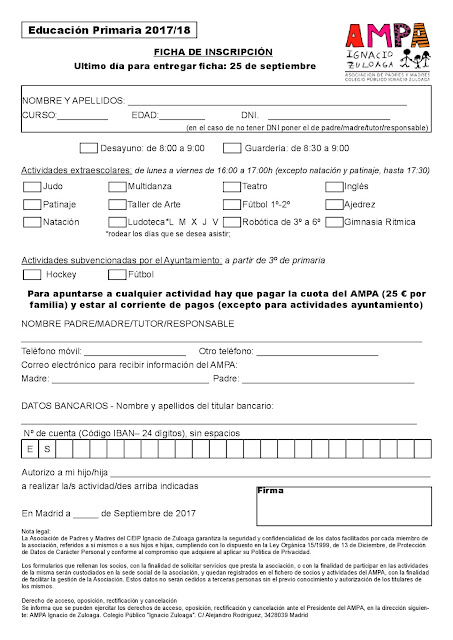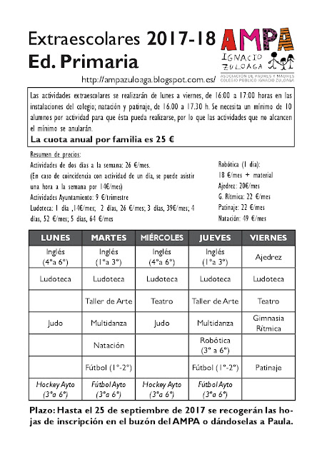 Desde la AMPA se están organizando las actividades extraescolares para este curso. Os dejamos aquí los folletos informativos y las hojas de inscripción. Por favor, las solicitudes deben entregarse antes del 25 de septiembre en el buzón o directamente a Paula. ¡Gracias!