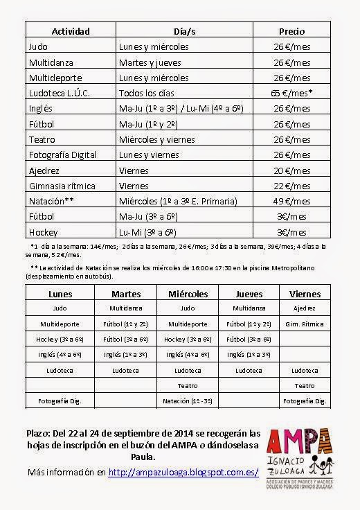 Subvencionadas por el Ayuntamiento y gestionadas por el Colegio; es imprescindible quealgún padre/madre cuyo hij@ participe en alguna de estas dos actividades, coordine la actividad con el colegio durante todo el curso. A diferencia del resto de actividades, la mensualidad no se cobra por recibo bancario.