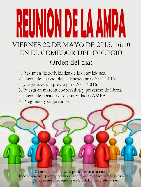 el próximo viernes 22 de mayo tendrá lugar al última asamblea de la AMPA del curso 2014-2015. Adjuntamos cartel con orden del día.