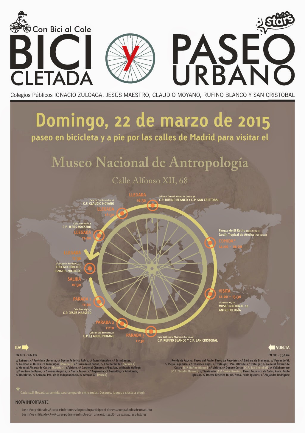 El próximo domingo 22 de marzo se llevará a cabo la Bicicletada correspondiente al 2º trimestre de este curso. Como veréis en el cartel adjunto, se realizará con otros centros del distrito de Chamberí. En esta ocasión el destino es el Museo Antropológico. ¡Os esperamos!