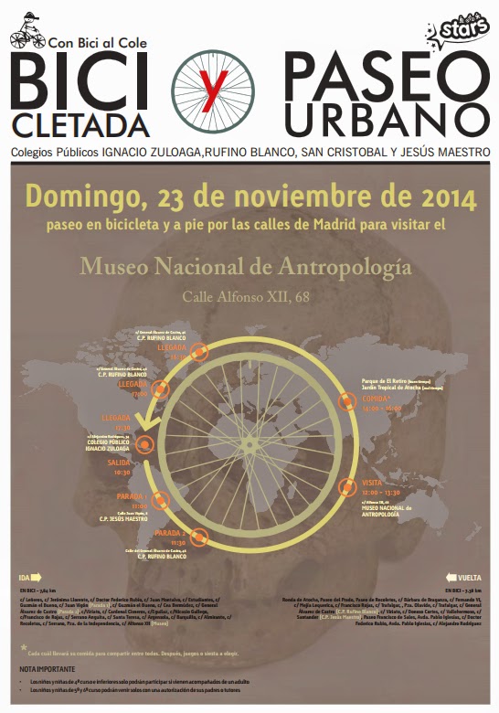 El próximo domingo 23 de noviembre se llevará a cabo la primera bicicletada del curso. El destino será el Museo Antropológico. Participarán familias de varios colegios de Tetuán y Chamberí. ¡Animaros! ¡Queda todo el mundo invitado!