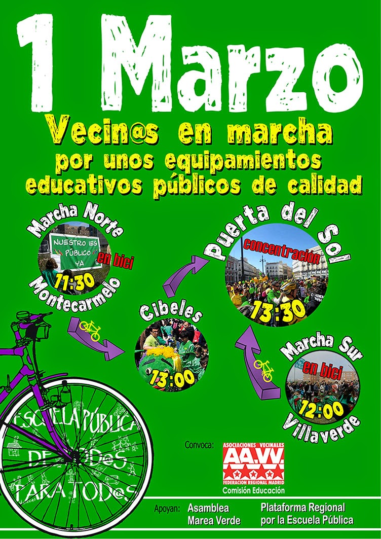 El próximo domingo 1 de Marzo, la FRAVM (Federación Regional de Asociaciones Vecinales de Madrid) convoca una BICICLETADA POR LA ESCUELA PÚBLICA.