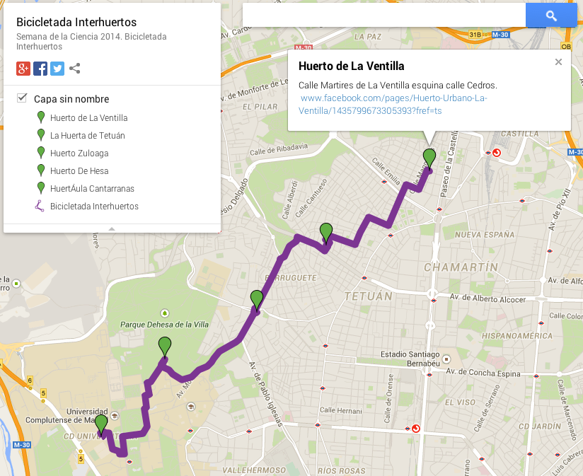 Este fin de semana, y dentro de las actividades de la Semana de la Ciencia, la Red de Huertos Urbanos de Madrid organiza una bicicletada por algunos huertos de la zona Noroeste de Madrid, incluidos en la Red. Salen del Huerto de la Ventilla a las 11:30 y pasan por nuestro futuro Huerto Zuloaga a las 12:30-13:00 Si alguien se anima, a la bicicletada completa o a pasarse por nuestro huerto, ahí va la info que nos han enviado desde la Red de Huertos