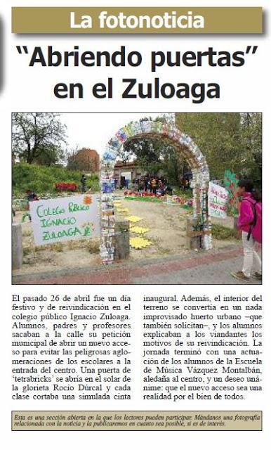 El Colegio Ignacio de Zuloaga participa el bloque temático: espacio público e intervenciones urbanas. En este marco, durante el curso 2012-2013, el AMPA ha colaborado intensamente con el colegio en el proyecto “Madrid Verde y Sostenible” con un doble objetivo: lograr un acceso al cole por la parte del patio trasero (acceso por la Glorieta de Rocío Jurado)