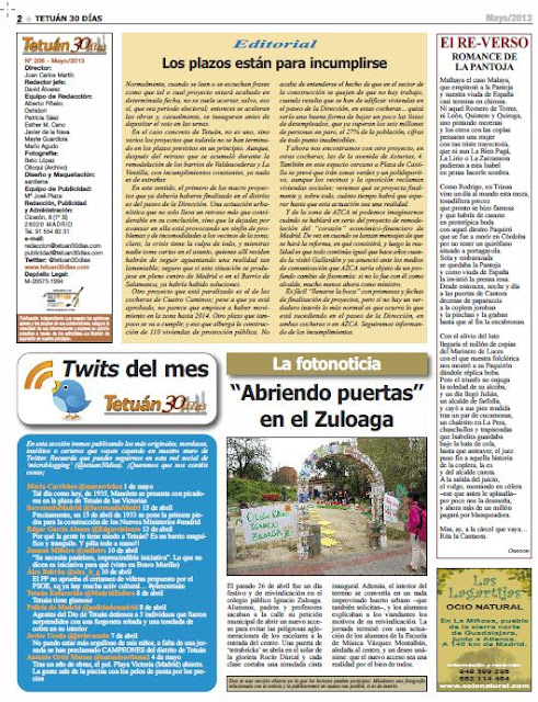 Como sabéis, el pasado día 26 de Abril, día en que plantamos el «huerto» en el solar, vinieron a vernos dos reporteros de «Tetuán 30 días». Estuvieron haciendo fotos y nos dijeron que la edición del periódico estaba cerrada y que era difícil meter la noticia, pero que lo intentarían. Y ahí está, os dejo la noticia: